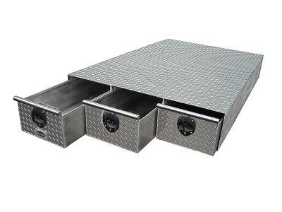 The BB96-3D three drawer aluminum tool box has become a popular model ever since we brought it out a few years ago. This unit is 95" Long x 48" Wide x 10 11/16" High. This unique aluminum truck bed tool box provides excellent organization through out the three drawers. Between the drawers are 1/4" vertical dividers that run the full length of the system. This gives you added strength for the top deck of the box.